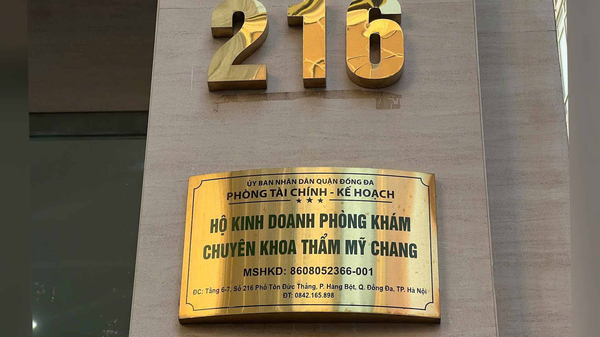 Theo chỉ dẫn, PV đến số 216 Tôn Đức Thắng, phường Ô Chợ Dừa, Hà Nội. Tuy nhiên, nơi đây không phải “Viện thẩm mỹ nội sinh CW - Hút mỡ thuần khiết, tặng nâng ngực nội sinh” như trên Fanpage, mà là Hộ kinh doanh Phòng khám Chuyên khoa thẩm mỹ Chang, mã số 8608052366-001 do Phòng Tài chính Kế hoạch quận Đống Đa (cũ) cấp.