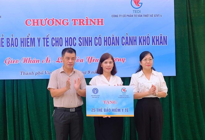 Lãnh đạo Bảo hiểm xã hội tỉnh Nghệ An trao tặng thẻ bảo hiểm y tế cho học sinh TP Vinh. Ảnh: Mỹ Hà
